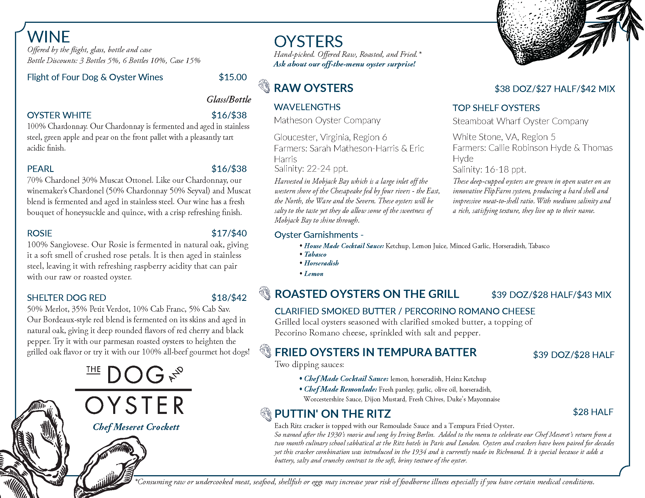 Enjoy “just out of the water” local oysters served a variety of ways! We showcase local oyster varieties from multiple farmers from several of Virginia’s oyster regions. Oysters are offered raw and roasted with a variety of garnishments, as well as a cocktail/shooter and for dessert.